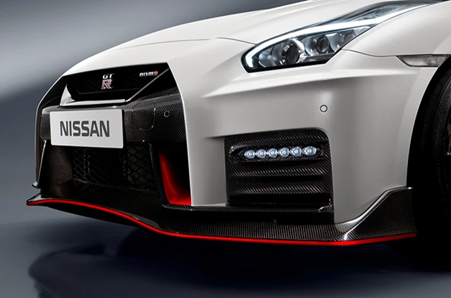 Nissan GT-R NISMO ใหม่ รูปลักษณ์ภายนอก ส่วนหน้าของ GT-R NISMO ปรับแต่งให้โฉบเฉี่ยวขึ้น โดยมีไฮไลท์อยู่ที่กันชนและกระจังหน้าใหม่แบบ V-Motion ที่เป็นโครเมียมรมดำ ขยายให้ใหญ่ขึ้น เพื่อรับและระบายอากาศได้เพิ่มมากขึ้นกว่าเดิม สำหรับฝากระโปรงปรับปรุงให้มีความแข็งแกร่งขึ้นเพื่อสร้างความมั่นใจในการขับขี่ในย่านความเร็วสูง โดยจะไม่เกิดการบิดตัวหรือเสียรูป และทำให้ตัวรถคงลื่นไหลได้ในทุกระดับความเร็ว