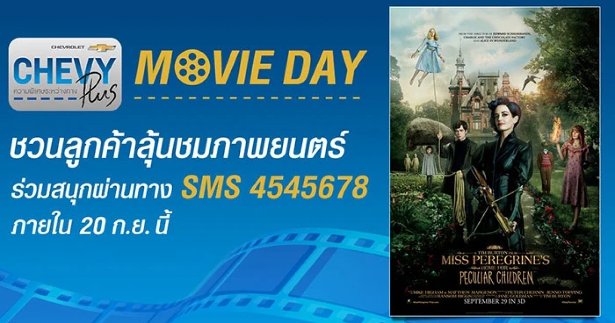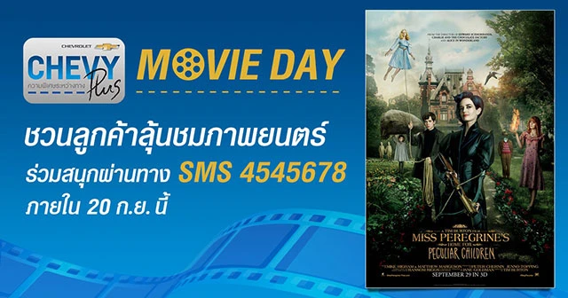เชฟโรเลต เซลส์ ประเทศไทย เชิญลูกค้าสมาชิกเชฟวี่ พลัส ร่วมกิจกรรมพิเศษ ลุ้นรับบัตรชมภาพยนตร์รอบปฐมทัศน์ เรื่อง Miss Peregrine's บ้านเพริกรินเด็กสุดมหัศจรรย์ วันที่ 29 กันยายนนี้