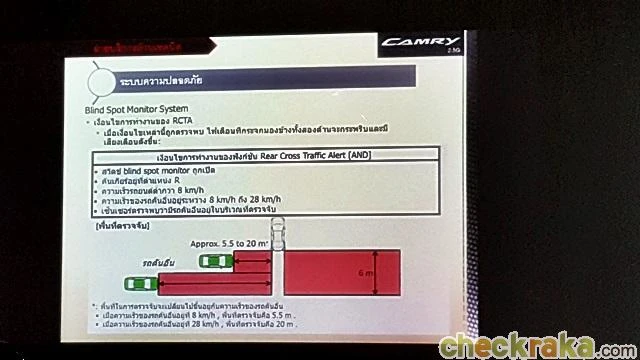 ทดสอบระบบเตือนขณะถอยหลัง (Real Cross Traffic Alert) ที่ติดตั้งในคัมรี่รุ่นนี้ จากการทดลองใส่เกียร์ถอยหลังคล้ายการออกจากซองจอด และจำลองสถานการณ์ด้วยรถมอเตอร์ไซค์ขี่ผ่านด้านหลัง ระบบนี้ก็จะเตือนด้วยเสียงและไฟสัญลักษณ์ที่กระจกมองข้างทั้งซ้าย-ขวา (ลักษณ์เดียวกับเตือนมุมอับสายตา) โดยเซ็นเซอร์นี้จะมีความไวเป็นอย่างมาก ความเร็วรถที่วิ่งผ่านตั้งแต่ 8 กม./ชม. มีระยะตรวจจับ 5.5 เมตรไล่ขึ้นไปเรื่อยๆ จนถึงความเร็ว 28 กม./ชม. ระยะตรวจจับ 20 เมตร และระยะความกว้างถึง 6 เมตร