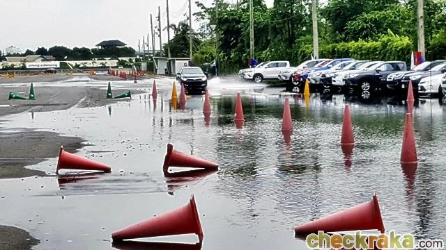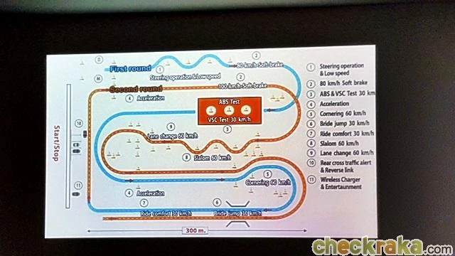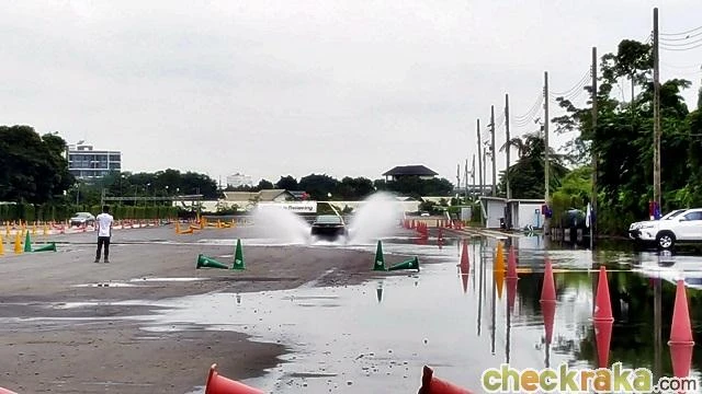 ทดสอบบนถนนเปียกลื่น การขับผ่านพื้นกระเบื้องที่เปียกลื่นเพื่อทดลองระบบ ABS/VSC/TRC ในความเร็ว 30 กิโลเมตรต่อชั่วโมง ซึ่งสามารถควบคุมให้รถไปในทิศทางซ้าย-ขวาตามไพล่อนได้อย่างปลอดภัย