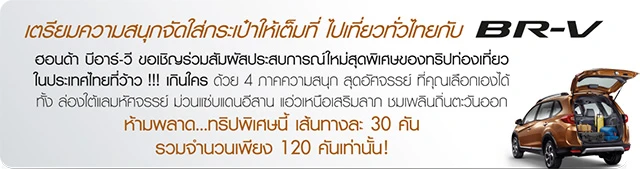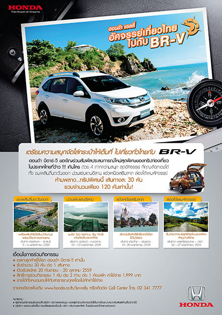 บริษัท ฮอนด้า ออโตโมบิล (ประเทศไทย) จำกัด จัดกิจกรรมแรลลี่ "อัศจรรย์เที่ยวไทยไปกับ BR-V" ชวนลูกค้าผู้ใช้รถยนต์ ฮอนด้า บีอาร์-วี ร่วมกิจกรรมและสัมผัสประสบการณ์ใหม่ที่คุณอาจไม่เคยได้สัมผัสมาก่อน ในเส้นทาง unseen 4 ภาคทั่วไทย ตลอดเดือนพฤศจิกายน รวม 120 คัน พร้อมเปิดรับสมัครทุกเส้นทาง ตั้งแต่วันนี้ - 20 ตุลาคม 2559