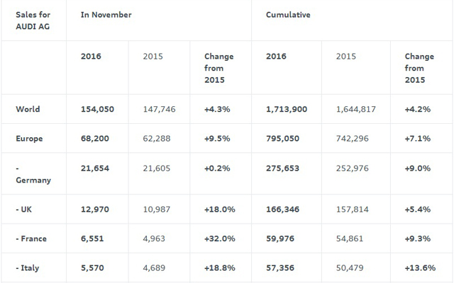 Audi โมเดลใหม่ Q2, Q5 ขายดีสุดๆ ส่วน Q7 ก็ขายดีมากในสหรัฐฯ โดย Audi มียอดจำหน่ายเฉพาะในเดือน พ.ย. ถึง 154,050 คัน เติบโตถึง 4.3% เมื่อเทียบกับช่วงเวลาเดียวกันของปีที่แล้ว