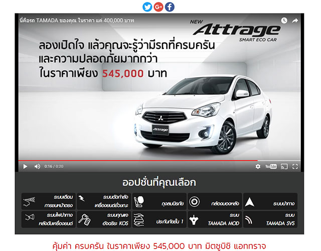 3. รับชมวิดีโอรถยนต์ TAMADA ที่สร้างขึ้นพร้อมราคาและจะนำเข้าสู่แอททราจ ใหม่ เพื่อแสดงให้เห็นว่ารถยนต์แอททราจ ใหม่ มีฟังก์ชั่นที่ครบครัน ในราคาที่สมเหตุสมผล ทั้งนี้ แคมเปญ Attrage TAMADA เริ่มตั้งแต่วันนี้ถึงวันที่ 31 ธันวาคม 2559 นี้
