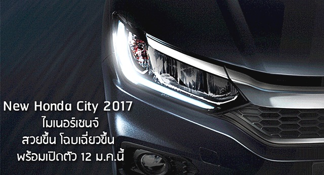 New Honda City 2017 ใหม่ เตรียมเปิดตัว 12 ม.ค. 2560 นับเป็นการปรับโฉมใหม่ เพิ่มความทันสมัยมากขึ้น ทั้งไฟหน้าพร้อม เดย์ไลท์แบบ LED กระจังหน้าทรงใหม่ และส่วนท้ายไฟท้าย LED ล้อแม็กลายใหม่ ไฟอ่านแผนที่ และไฟห้องโดยสาร LED เบาะทรงใหม่ ครุซคอนโทรล เครื่อง 1.5 ลิตร 117 แรงม้า CVT