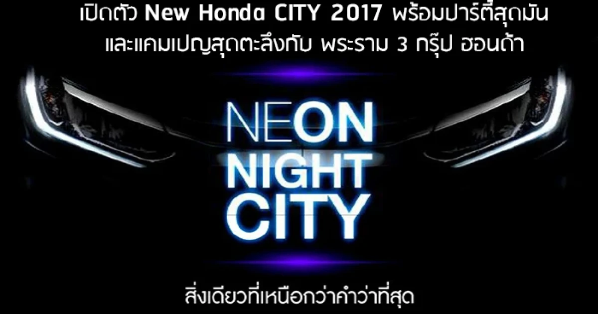 เตรียมพบกับความงามที่ลงตัวในภาพลักษณ์ใหม่กับ "New Honda City" โฉมใหม่ พร้อมกันทั่วประเทศ โดยทางพระราม 3 กรุ๊ป ฮอนด้าไม่ใช่เพียงแค่เปิดตัวซิตี้ใหม่เท่านั้น แต่เตรียมจัดงาน "NEON NIGHT CITY" พร้อมกับการเปิดตัวรถยนต์ฮอนด้า รุ่นใหม่ "New Honda City" ปรับโฉมใหม่ทันสมัยมากขึ้น พร้อมความสะดวกสบายและความปลอดภัยในราคาที่น่าเป็นเจ้าของเช่นเดิม และยังรู้ใจผู้ซื้อรถด้วยแคมเปญสุดพิเศษที่คุณต้องตะลึง! ในวันที่ 12 ม.ค.นี้ ตั้งแต่ 17.30. เป็นต้นไป ณ พระราม 3 กรุ๊ป ฮอนด้า สาขาถนนนราธิวาสฯ