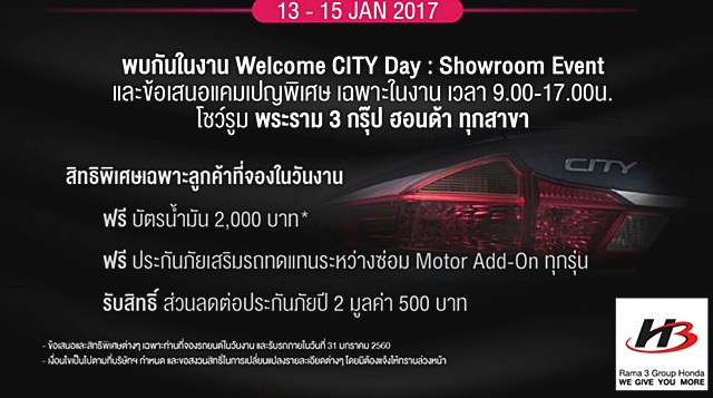 ปิดท้ายด้วยกิจกรรมต่อเนื่องจากพระราม 3 กรุ๊ป ฮอนด้า ด้วยงาน "Welcome City Day : Showroom Event" ระหว่างวันที่ 13 - 15 ม.ค. 2560 พร้อมข้อเสนอแคมเปญพิเศษ เฉพาะในงานนี้ เวลา 9.00 - 17.00 น. เมื่อจองในงานรับฟรี บัตรเติมน้ำมัน 2,000 บาท ฟรีประกันภัยเสริมรถทดแทนระหว่างซ่อม Motor Add-On และรับสิทธิ์ส่วนลดต่อประกันภัยปีที่ 2 มูลค่า 500 บาท