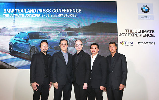 บีเอ็มดับเบิลยู ประเทศไทย นำโดย มร. ลาร์ส นีลเซ่น ผู้อำนวยการฝ่ายขายและการตลาด (กลาง) ร่วมกับ บริษัท การบินไทย จำกัด (มหาชน) โดยคุณกรกฏ ชาตะสิงห์ (ที่ 2 จากซ้าย) ผู้อำนวยการฝ่ายขาย-ประเทศไทย และบริษัท บริดจสโตนเซลส์ (ประเทศไทย) จำกัด โดย มร. ชินยะ ฮิซาดะ (ที่ 4 จากซ้าย) ผู้อำนวยการสายงานธุรกิจ ยางรถยนต์นั่งและรถบรรทุกขนาดเล็ก เปิดตัวโปรแกรมสุดเอ็กซ์คลูซีฟ "The Ultimate JOY Experience" โดยมี คุณเศรษฐิพงศ์ อนุตรโสตถิ (ซ้ายสุด) ผู้จัดการทั่วไปฝ่ายการตลาด บีเอ็มดับเบิลยู ประเทศไทย และ คุณกฤษฎา อุตตโมทย์ (ขวาสุด) ผู้อำนวยการฝ่ายสื่อสารกิจการองค์กร บีเอ็มดับเบิลยู กรุ๊ป ประเทศไทย ร่วมแถลงข่าว