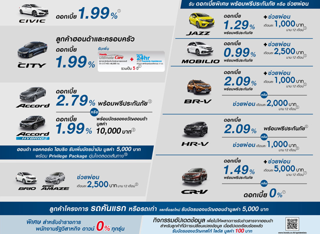 พร้อมแคมเปญเพื่อข้าราชการ พนักงานรัฐวิสาหกิจ ดาวน์ 0% ทุกรุ่น และสำหรับลูกค้ารถคันแรกหรือจะเป็นรถเก่าและซื้อรถใหม่ รับบัตรของขวัญฮอนด้ามูลค่า 5,000 บาท
