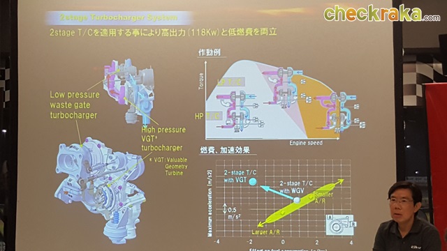 โดยจะทำงานร่วมกันตั้งแต่รอบต้นที่ต้องการอัตราเร่งเพื่อใช้ในการออกตัว ซึ่ง High Pressure Turbo มีการติดตั้ง Variable Geometry Turbocharger (VGT) เพื่อช่วยในการตอบสนองต่ออัตราเร่งที่รวดเร็วทันใจในช่วงรอบต้น ช่วยลดการสูญเสียกำลังของเครื่องยนต์โดยไม่จำเป็น อีกทั้งเพิ่มประสิทธิภาพการประหยัดน้ำมัน เมื่อต้องการอัตราเร่งในช่วงความเร็วสูง Low Pressure Turbo ที่ควบคุมการทำงานผ่าน Waste gate Type Turbocharger จะช่วยเสริมการทำงานเพื่อให้ได้กำลังและแรงบิดที่สูงขึ้นในการขับขี่ โดย High Pressure Turbo และ Low Pressure Turbo จะมีการสลับการทำงานในช่วงกลางที่ความเร็วคงที่ เมื่อระบบทำงานผสานกัน จะให้ประสิทธิภาพเพื่อการเผาไหม้อย่างสูงสุด