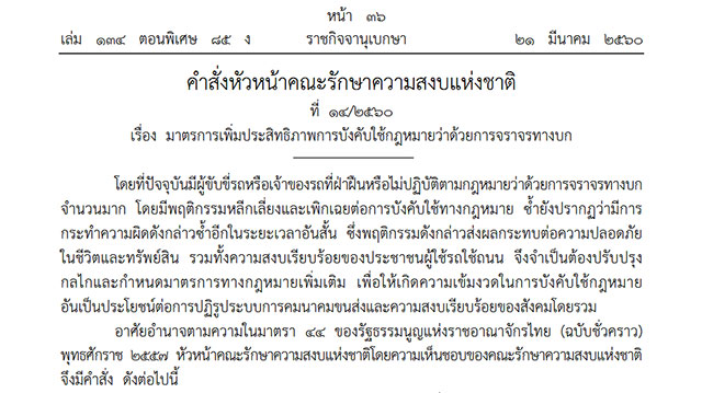 อาศัยอํานาจตามความในมาตรา 44 ของรัฐธรรมนูญแห่งราชอาณาจักรไทย (ฉบับชั่วคราว) พุทธศักราช 2557 หัวหน้าคณะรักษาความสงบแห่งชาติโดยความเห็นชอบของคณะรักษาความสงบแห่งชาติ มีคําสั่งให้แก้ไขหรือยกเลิกความในวรรคต่างๆ แห่งพระราชบัญญัติจราจรทางบก พ.ศ.2522 ซึ่งแก้ไขเพิ่มเติมโดยพระราชบัญญัติจราจรทางบก (ฉบับที่ 4) พ.ศ.2535