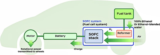 นิสสันมีโครงงานการวิจัยและพัฒนาเทคโนโลยีขับเคลื่อน Solid Oxide Fuel-Cell (SOFC)-powered system ซึ่งขับเคลื่อนในรูปแบบใช้พลังงาน Bio-Ethanol Electric Power โดยถือเป็นครั้งแรกของโลกที่ผู้ผลิตรถยนต์นำระบบนี้มาใช้ ซึ่งมีจุดเด่นคือ ระบบ e-Bio Fuel-Cell ที่มาพร้อมกับตัวสร้างพลังงานแบบ SOFC ซึ่ง SOFC คือ เทคโนโลยีเซลล์เชื้อเพลิงที่สามารถรองรับกับการใช้เชื้อเพลิงได้หลากหลายในการทำปฏิกิริยากับออกซิเจนเพื่อสร้างกระแสไฟฟ้า ซึ่งเชื้อเพลิงที่ว่าก็รวมถึงการใช้เอทานอล และก๊าซธรรมชาติ