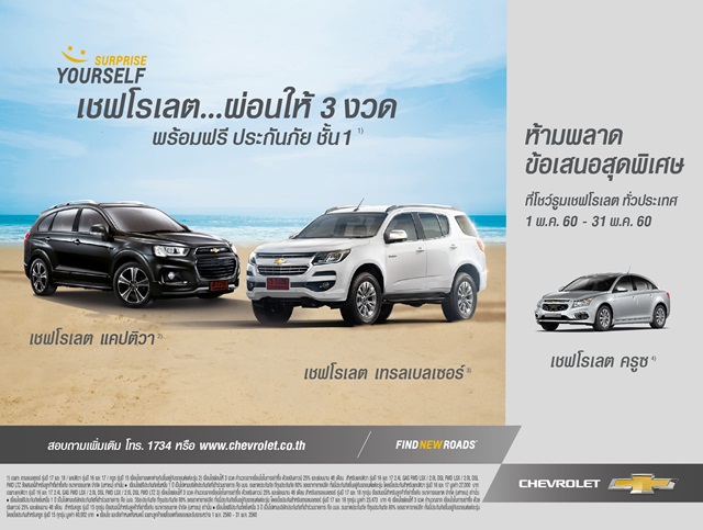 โปรโมชั่นส่งเสริมการขายมีผลสำหรับผู้ที่ซื้อรถเชฟโรเลตรุ่นที่ร่วมรายการระหว่างวันที่ 1 - 31 พฤษภาคม 2560 เงื่อนไขและข้อกำหนดเป็นไปตามที่เชฟโรเลต เซลส์ ประเทศไทยกำหนด