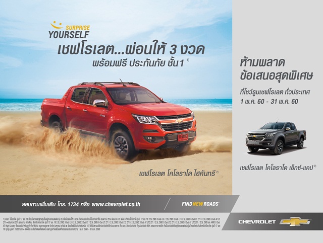 ลูกค้าสามารถเป็นเจ้าของรถกระบะโคโลราโด (Colorado) ได้อย่างสะดวกสบายมากขึ้นด้วยโปรโมชั่นสุดพิเศษ Surprise Yourself เชฟโรเลตช่วยผ่อนชำระ 3 เดือนแรก และรับฟรีประกันภัยชั้นหนึ่ง 1 ปีเมื่อชำระเงินดาวน์ 25% และผ่อนนาน 72 เดือน*