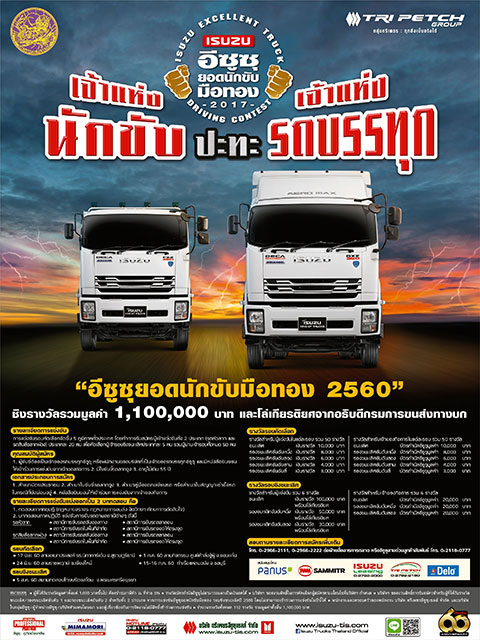อีซูซุ ร่วมกับ กรมการขนส่งทางบก จัดการแข่งขัน "อีซูซุยอดนักขับมือทอง" ประจำปี 2560 ต่อเนื่องเป็นปีที่ 12 พร้อมนำสุดยอดรถบรรทุกอีซูซุ ใหม่! เจ้าแห่งรถบรรทุก "Isuzu King of Trucks" ที่เพิ่งเปิดตัวไปเมื่อไม่นานมานี้ ร่วมประลองฝีมือการขับขี่ของสิงห์รถบรรทุกทั่วประเทศ เฟ้นหาเจ้าแห่งนักขับรถบรรทุกเมืองไทย ชิงรางวัลรวมมูลค่า 1,100,000 บาท พร้อมโล่เกียรติยศ เพื่อส่งเสริมการพัฒนาศักยภาพการขับขี่อย่างมีประสิทธิภาพและปลอดภัย และต่อยอดสู่ความเป็นที่หนึ่งร่วมกันของธุรกิจขนส่งยุคใหม่ในแบบ "อีซูซุ...คู่คิดมืออาชีพ"