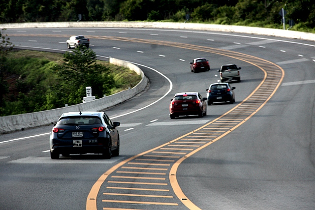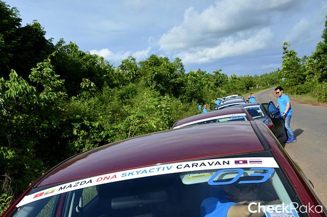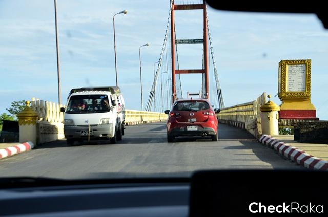 ผู้เขียนพร้อมสมาชิกคาราวาน มาสด้า ดีเอ็นเอ สกายแอคทีฟ กลุ่มสอง เดินทางมารอเปลี่ยนกลุ่มแรกที่เดินทางมาจากดานัง ประเทศเวียดนามที่พิษณุโลก โดยเริ่มออกเดินทางกันในช่วงเช้าประมาณ 9.00 น. จากโรงแรมภัทราในตัวเมืองแล้วใช้ทางหลวงหมายเลข 12 ส่วนหนึ่งของเส้น R2 อันเป็นเส้นทางระเบียงเศรษฐกิจแนวตะวันออก-ตะวันตก มุ่งสู่เป้าหมายแรกของวันที่แม่สอด จังหวัดตาก การเดินทางครึ่งวันแรกจากพิษณุโลกวิ่งตามแนวขวางผ่านจังหวัดสุโขทัย ถนนกว้างและค่อนข้างเป็นทางตรงยาวขับกันสบายๆ ผู้เขียนนั่งใน มาสด้า 2 รุ่นเครื่องยนต์เบนซิน 1.3 ลิตร ในตำแหน่งเบาะหลังก็นั่งเพลินๆ จนมาถึงปั้มปตท. ริมถนนไฮเวย์ก่อนข้ามอุทยานแห่งชาติลานสาง ราว 11.00 น. ก็เข้าแวะเติมน้ำมัน ผู้เขียนเปลี่ยนมาทำหน้าที่ขับเพื่อไปพักรับประทานอาหารกลางวันในแม่สอดก่อนข้ามแดน เส้นทางข้ามอุทยานฯ ลานสาง นับเป็นความท้าทายไม่น้อยเพราะเป็นทางขึ้น-ลงเขาที่มีโค้งซ้าย-ขวามากมาย ความตื่นเต้นไม่ใช่แค่เส้นทางแบบเดิมๆ แต่เพิ่มเติมโดยการทำทางขยายถนนสองข้างทาง โดยมีรถใหญ่วิ่งร่วมด้วย ทำให้บ่อยครั้งที่ขบวนฯ ต้องชะลอเพื่อหาจังหวะแซง และสลับทางเบี่ยงที่มีการสลับทำทาง แต่ด้วยสมรรถนะของรถมาสด้า 2 ที่พิสูจน์แล้วว่าเพียงพอต่อการพาผู้โดยสาร 3 คนพร้อมสัมภาระ บ้ายหน้าขึ้นเขา เร่งแซงรถช้า พร้อมพิชิตโค้งต่อโค้งได้อย่างไม่มีปัญหา แค่คำนวณจังหวะและระยะให้ดีก่อนเท่านั้น ขบวนฯ มาถึงร้านอาหารในแม่สอดใกล้บ่ายโมง หลังจากอิ่มกันทั่วหน้าก็เคลื่อนขบวนฯ มุ่งหน้าสะพานมิตรภาพไทย-พม่า หลังผ่านด่านตรวจคนเข้าเมืองเรียบร้อย ขบวนคาราวาน มาสด้า ดีเอ็นเอ สกายแอคทีฟ ก็เข้าสู่เมียวดี แล้วใช้เสันทางใหม่ที่ไม่ต้องข้ามเขาสูงมากเท่าทางเดิมและใช้เวลาน้อยกว่าด้วย ขบวนฯ มาถึง ก็อกกะเร็ก (Kawkareik) แล้วมุ่งหน้าสู่มะละแหม่ง หรือ เมาะลำไย อันเป็นจุดสิ้นสุดของการเดินทางวันแรก