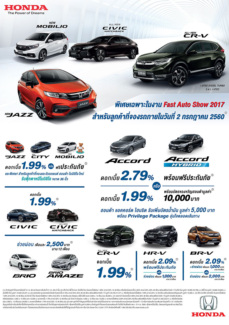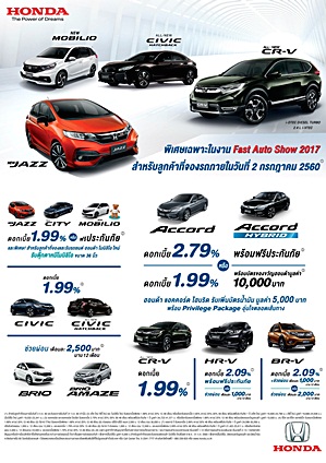 Honda รถยนต์ที่ตอบสนองครบทุกระดับมอบโปรโมชั่นเด็ดในงาน Fast Auto Show Thailand 2017 เอาใจลูกค้าด้วยข้อเสนอสุดเร้าใจ ด้วยยนตรกรรม 11 รุ่น นำโดย 5 รุ่นใหม่ล่าสุดที่เพิ่งเปิดตัวในปีนี้ ทั้ง ฮอนด้า ซีอาร์-วี ใหม่ (Honda CR-V), ซีวิค แฮตช์แบ็ก ใหม่ (Honda Civic Hatchback), แจ๊ส ใหม่ (Honda Jazz), โมบิลิโอ ใหม่ (Honda Mobilio) และซิตี้ ใหม่ (Honda City) พร้อมมอบข้อเสนอสุดพิเศษในการเป็นเจ้าของรถยนต์ฮอนด้า ภายในงาน ระหว่างวันที่ 28 มิถุนายน - 2 กรกฎาคม นี้ ณ บูธ A04 ศูนย์นิทรรศการและการประชุมไบเทค ฮอลล์ 106