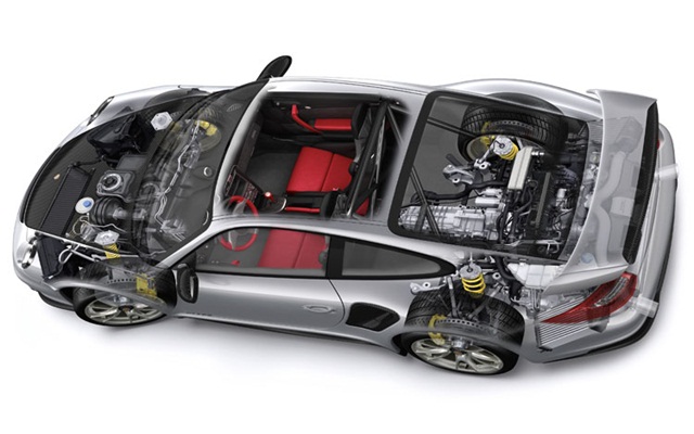ปอร์เช่ 911 จีที 2 อาร์เอส (911 GT2 RS) ใหม่ ติดตั้งชุดแต่งเพิ่มสมรรถนะ Weissach package โดยสามารถลดน้ำหนักรวมของตัวรถลงได้อีกกว่า 30 กิโลกรัม ประกอบด้วยอุปกรณ์เพิ่มเติมที่ผลิตจากวัสดุ carbon-fiber reinforced plastic และไทเทเนียม เช่น โครงหลังคาและเหล็กกันโคลง รวมทั้งชุดลูกหมากทุกจุดทั้งบริเวณช่วงล่างด้านหน้าและด้านหลังสร้างขึ้นจากคาร์บอน ล้อแม็กผลิตจากวัสดุแมกนีเซียม เพื่อลดน้ำหนักทั้งในแง่ของน้ำหนักรวมและน้ำหนักใต้สปริงหรือ unsprung weight ส่งผลโดยตรงต่อคุณสมบัติในการบังคับควบคุมที่เป็นเลิศของระบบช่วงล่างและตัวถัง ฝากระโปรงท้ายและส่วนต่อเนื่องของหลังคาและกระจกบานหลังผลิตจากวัสดุคาร์บอนลวดลายเดียวกับเส้นคาดกลางแนวตัวรถ เพื่อภาพลักษณ์อันสมดุลกลมกลืนเป็นหนึ่งเดียว