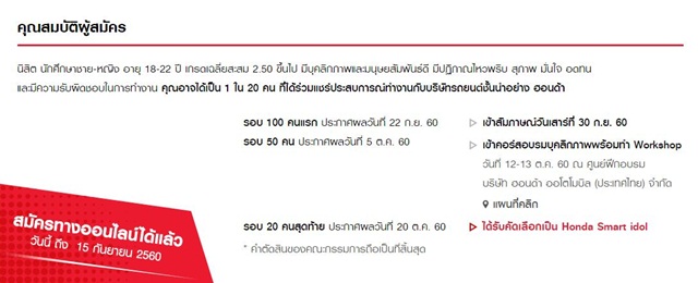 นิสิต นักศึกษา ที่มีอายุตั้งแต่ 18-22 ปี และมีเกรดเฉลี่ยสะสมตั้งแต่ 2.50 ขึ้นไป สนใจสมัครเข้าร่วมโครงการ Honda Smart idol สามารถเข้าไปกรอกใบสมัครผ่านทางออนไลน์ พร้อมอัพโหลด รูปถ่ายชุดนิสิต นักศึกษา และรูปถ่ายเต็มตัว รวมถึงเอกสารใบรับรองผลการเรียน หรือดูรายละเอียดเพิ่มเติม ได้ที่ http://bit.ly/2uPYMie ตั้งแต่วันนี้ - 15 กันยายน 2560