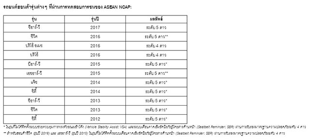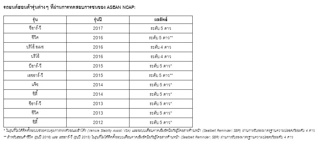 บริษัท ฮอนด้า ออโตโมบิล (ประเทศไทย) จำกัด ประกาศความสำเร็จของ ฮอนด้า ซีอาร์-วี ใหม่ (Honda CR-V 2017) ที่ได้ผ่านการรับรองมาตรฐานความปลอดภัยระดับ 5 ดาว จากการทดสอบการชนของ ASEAN NCAP ซึ่งฮอนด้า ซีอาร์-วี ใหม่ นับเป็นยนตรกรรมรุ่นแรกที่ผ่านการรับรองมาตรฐานความปลอดภัยระดับ 5 ดาว ภายใต้หลักเกณฑ์การประเมินรูปแบบใหม่ปี 2560 - 2563 (New ASEAN NCAP Assessment 2017-2020 Protocol) นับเป็นการตอกย้ำความมุ่งมั่นในการสร้างสรรค์ยนตรกรรมที่มีคุณภาพและมาพร้อมเทคโนโลยีด้านความปลอดภัย อีกทั้งพร้อมสร้างความปลอดภัยบนท้องถนนให้กับลูกค้าและผู้ใช้ถนนทุกคน