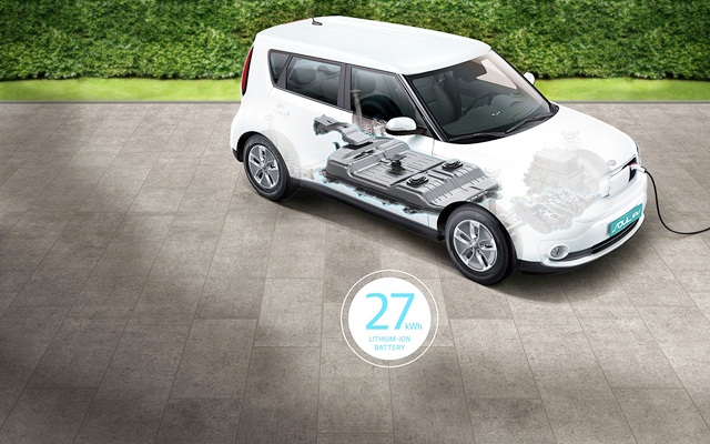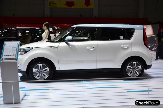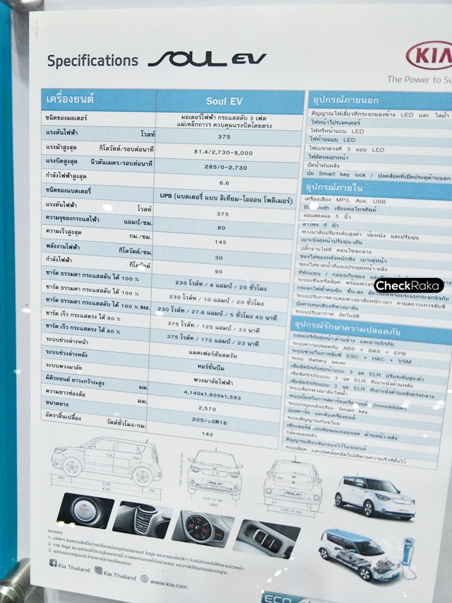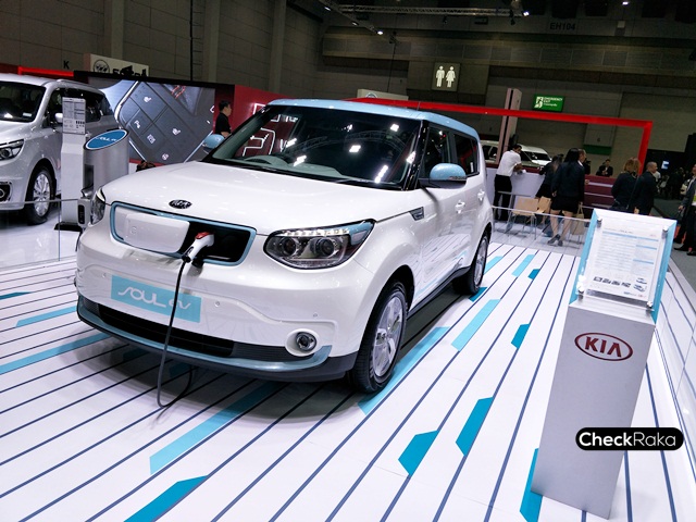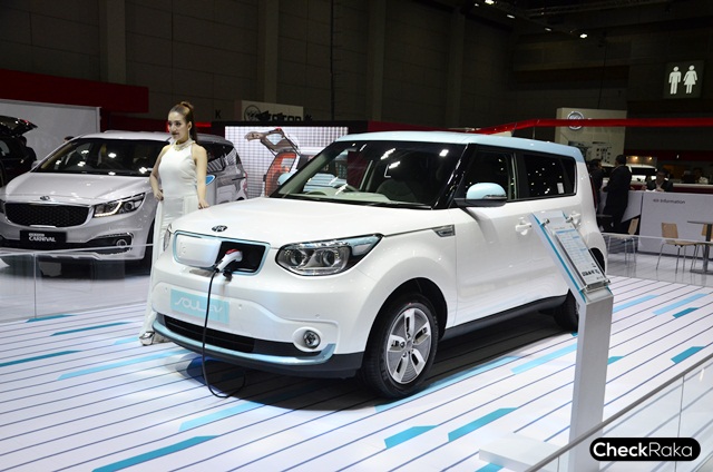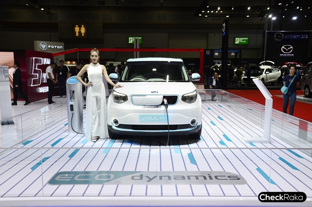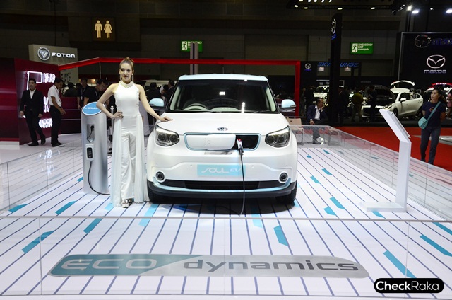 ไฮไลท์เด็ดในบูธรถยนต์เกียอยู่ที่ KIA Soul EV นับเป็นรถยนต์ไฟฟ้าล้วนครั้งแรกของเกียที่นำเข้ามาโชว์ตัวจริงในไทย พื้นฐานจาก KIA Soul แต่ปรับเปลี่ยนระบบการขับเคลื่อนต่างๆ รวมถึงแบตเตอรี่แบบ LIPB - ลิเธียม-ไอออน โพลีเมอร์ พร้อมมอเตอร์ไฟฟ้าขนาด 375 โวลต์ กำลังสูงสุด 81.4 กิโลวัตต์ ที่ 2,730 - 8,000 รอบต่อนาที (ประมาณ 110 แรงม้า) แรงบิด 285 นิวตันเมตร ที่ 0 - 2,730 รอบต่อนาที สามารถทำความเร็วสูงสุดได้ถึง 145 กิโลเมตรต่อชั่วโมง มีอัตราสิ้นเปลือง 142 วัตต์ชั่วโมงต่อกิโลเมตร และสามารถวิ่งได้ 250 กิโลเมตรต่อการชาร์จเต็ม 1 ครั้ง