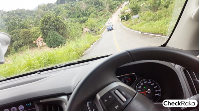 กำลังเครื่องยนต์ตอบสนองฉับไวและมีกำลังมากสามารถไต่ระดับความชันของยอดเขาได้อย่างต่อเนื่อง แม้จะมีเนินสลับซ้าย-ขวา ก็เร่งขึ้นต่อไปได้อย่างสบายๆ ครับ ส่วนในช่วงลงทางชัน เมื่อลองเปิดระบบควบคุมความเร็วขณะลงทางลาดชัน (HDC) ก็จะได้ยินเสียงการทำงานของปั๊ม ABS ที่กำลังช่วยปรับความเร็วล้อทั้ง 4 ให้สอดคล้องและควบคุมระดับความเร็วขณะลงเขาได้อย่างดีเยี่ยมและคนขับแทบไม่ต้องใช้ทักษะใดๆ มากนัก เพียงควบคุมทิศทางตามถนนก็ผ่านไปได้อย่างสบาย