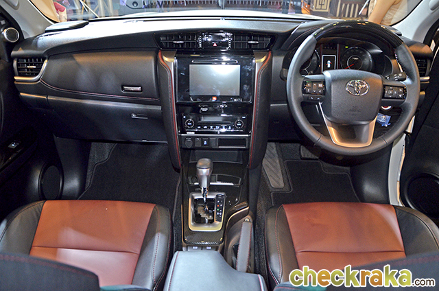 Toyota Fortuner TRD Sportivo ภายในห้องโดยสารตกแต่งเพิ่มเติม อาทิ ภายในสีดำแดงสไตล์สปอร์ต วัสดุหนังสีดำสลับแดง พร้อมชุดแต่งลายเคฟลาร์ และแถบโครเมียมรมดำ, เบาะหนังและหนังสังเคราะห์สีดำสลับแดงพร้อมเดินด้ายแดง สไตล์สปอร์ต, มาตรวัดเรืองแสงแบบ Optitron ดีไซน์ใหม่ ด้วยลายเคฟลาร์ และไฟแสดงผลสีแดง, ชุดเครื่องเสียง Premium Audio พาวเวอร์แอมป์ และลำโพง JBL 9 ตำแหน่ง 11 ลำโพง, ระบบนำทาง (Navigator) รองรับ T-Connect พร้อมเครื่องเล่น DVD หน้าจอแบบสัมผัสขนาด 7 นิ้ว เชื่อมต่อ Bluetooth และกล้องมองหลัง, ปุ่ม Push Start พร้อมสัญลักษณ์ TRD และกุญแจ Smart Key พร้อมสัญลักษณ์ TRD