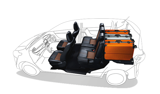 ห้องโดยสารภายในกว้างขวาง สะดวกสบาย เบาะพับง่ายแค่เพียงสัมผัส (1-Touch Tumble) จอ LED ขนาด 8 นิ้ว สำหรับผู้โดยสารแถวหลัง ที่เก็บของบริเวณคอนโซลหน้า พร้อมระบบรักษาความเย็น (Cool Box) ที่วางของ และช่องเก็บของสำหรับผู้โดยสารทุกแถว
