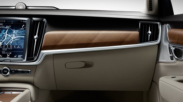 ภายในของ Volvo S90 โก้หรูด้วยแผงหน้าปัดที่ที่แสดงผลกราฟิกขนาดใหญ่ 12.3 นิ้ว (ในรุ่น T8 Twin Engine) พิถีพิถันแม้กระทั่งปุ่มปรับทิศทางของช่องลมแอร์แนวตั้งที่ขัดเกลาเคลือบด้วยโลหะรูปทรงเพชร ระบบกรองอากาศ Clean Zone ที่ดักละอองฝุ่น เกสรดอกไม้ อันเป็นสาเหตุของโรคภูมิแพ้ และสูดสัมผัสได้ถึงบรรยากาศในรถที่บริสุทธิ์สะอาดเหมือนที่สวีเดน