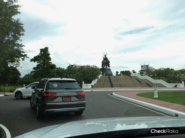 จากนั้นขบวน Audi ก็ออกเดินทางต่อไปยัง พระราชอนุสาวรีย์สมเด็จพระศรีสุริโยทัย (ทุ่งมะขามหย่อง) เพื่อถ่ายภาพหมู่กันเล็กน้อย ก่อนจะไปร้านอยุธยารีทรีท เพื่อแวะพักจุดสุดท้ายก่อนจะเดินทางกลับ โดยช่วงสุดท้ายนี้ทีมงานเช็คราคา.คอม ได้รับไม้ขับ Q7 ขับกลับกรุงเทพฯ ตลอดระยะทางประมาณ 80 กม. การขับ Q7 นั้นพวงมาลัยเป็นมัลติฟังก์ชั่น 3 ก้าน แบบสปอร์ต ขนาดกระชับมือ พร้อมแพดเดิลชิฟท์เพื่อเปลี่ยนเกียร์บริเวณพวงมาลัย ทางด้านความรู้สึกจากการขับขี่ ถึงแม้จะมีตัวถังขนาดใหญ่แต่ก็ไม่ใช่ปัญหาเมื่อพละกำลัง 249 แรงม้า จากเครื่องยนต์ดีเซลนั้นตอบสนองได้ตามต้องการในทุกๆ จังหวะการขับขี่ในช่วงทางด่วนโล่งๆ แต่พอเวลารถติดก็ให้อารมณ์การขับขี่ที่คล่องตัวแม้จะมีรูปร่างใหญ่โต และรอบเครื่องยนต์ก็ไม่สูงมากนักเพื่อการประหยัดน้ำมันเชื้อเพลิง ในย่านความเร็ว 100-120 กม./ชม. ก็ใช้รอบเครื่องยนต์ไม่ถึง 2,000 รอบ/นาที เท่านั้น ซึ่งในเที่ยวกลับนี้เองเราก็ได้ลองปรับโหมดการขับขี่ดู