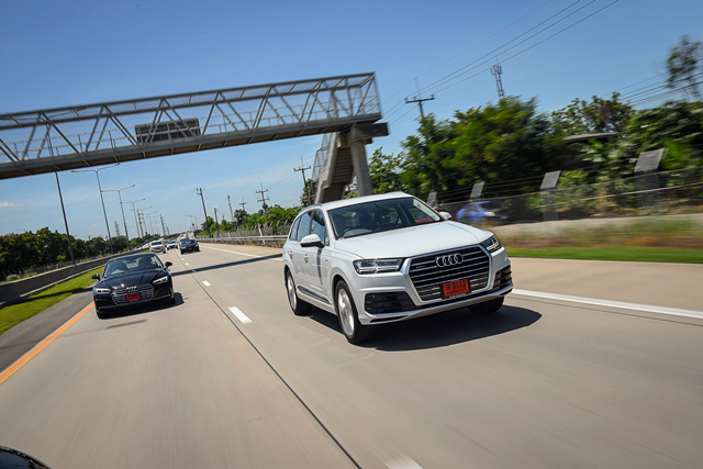 ในช่วงแรกนี้เพื่อนสื่อมวลชนเป็นคนขับให้ทีมงาน เช็คราคา.คอม ของเราเป็นผู้โดยสารก่อน การเดินทางเริ่มต้นออกจาก โชว์รูม Audi ที่ ถ.เพชรบุรีตัดใหม่ ขึ้นทางด่วนที่ด่านอโศก มุ่งหน้าไปยังแจ้งวัฒนา ก่อนจะต่อเนื่องไปทาง งามวงศ์วาน และผ่านด่านประชาชื่นอีกต่อ จากนั้นก็ออกเดินทางไปตามเส้นทางบางปะอิน-ปากเกร็ด (อุดรรัถยา) ผ่านด่านบางปะอิน นั้นเป็นการเดินทางที่ต้องพบเจอกับสภาพการจราจร 2 แบบ แบบแรกคือการจราจรติดขัดในเมือง กับสภาพการจราจรโล่งๆ บนทางด่วน ถึงแม้จะเป็นช่วงระยะทางไม่ไกลมากแต่ก็สัมผัสได้ถึงความสะดวกสบายของ Q7 ด้วยช่วงล่างแบบแบบถุงลมให้การตอบสนองที่นุ่มนวล พละกำลังเครื่องยนต์ดีเซลก็ตอบสนองได้ตามต้องการในทุกๆ จังหวะ จนถึงจุดจอดแรกที่ แกรนด์ เจ้าพระยา อยุธยา ตลอดระยะทางในช่วงแรกเกือบๆ 80 กม.