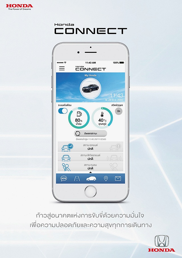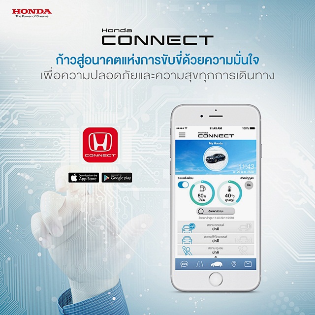 บริษัท ฮอนด้า ออโตโมบิล (ประเทศไทย) จำกัด เปิดตัว "ฮอนด้า คอนเนค (Honda Connect)" นวัตกรรมเพื่อการขับขี่อย่างมั่นใจและเพื่อความปลอดภัยในทุกการเดินทาง เป็นเทคโนโลยีที่ผสานการทำงานกับแอปพลิเคชันบนมือถือสมาร์ทโฟน โดยผู้ขับขี่และรถยนต์สามารถเชื่อมต่อและสื่อสารกันได้เพียงปลายนิ้วสัมผัส ซึ่งช่วยเตรียมความพร้อมให้รถยนต์และผู้ขับขี่ เพื่อความปลอดภัยบนท้องถนน และเพิ่มความสะดวกสบายในการใช้รถยนต์ นับเป็นจุดเริ่มต้นของสังคมการขับขี่แห่งอนาคตที่เทคโนโลยีจะเป็นส่วนหนึ่งในการสร้างความมั่นใจให้ผู้ใช้รถใช้ถนน โดยฮอนด้า คอนเนค มาพร้อมฟังก์ชั่นหลักทั้งการตรวจสอบและแจ้งเตือนสถานะความพร้อมของรถยนต์ การแสดงข้อมูลลักษณะการขับขี่ และหากเกิดเหตุการณ์ไม่คาดคิดฮอนด้า คอนเนค ยังมีระบบติดต่อช่วยเหลือในกรณีฉุกเฉิน เพื่อเพิ่มความมั่นใจมากขึ้นในตลอดทุกการเดินทาง