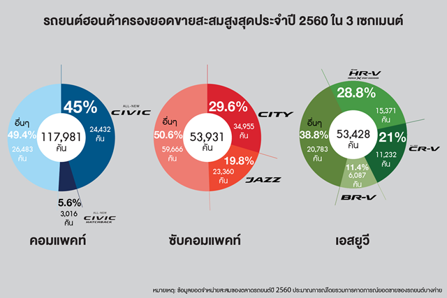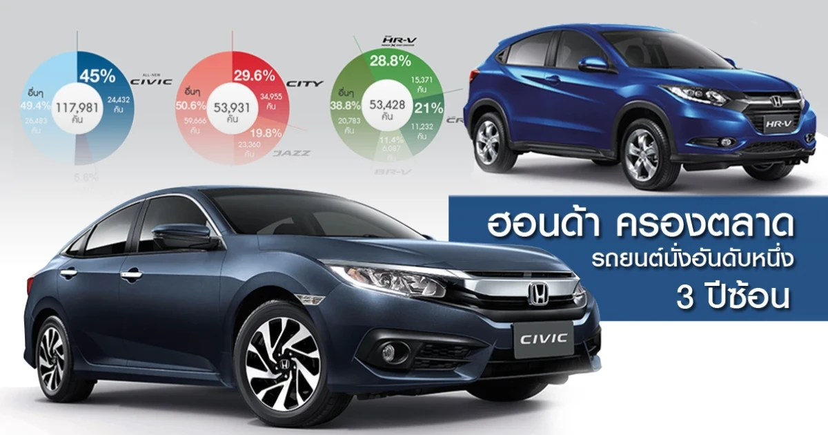 สำหรับยอดจำหน่ายรถยนต์ฮอนด้าในปี 2560 ที่กระแสตอบรับดีทั้งหมด 5 รุ่น ได้แก่ ซิตี้, ซีวิค แฮตช์แบ็ก, ซีอาร์-วี, แจ๊สและโมบิลิโอ ประกอบกับความเชื่อมั่นของลูกค้าที่มีต่อผลิตภัณฑ์ ทำให้ฮอนด้ายังคงรักษาอันดับหนึ่งตลาดรถยนต์นั่งส่วนบุคคลของประเทศไทยได้เป็นปีที่ 3 ติดต่อกัน