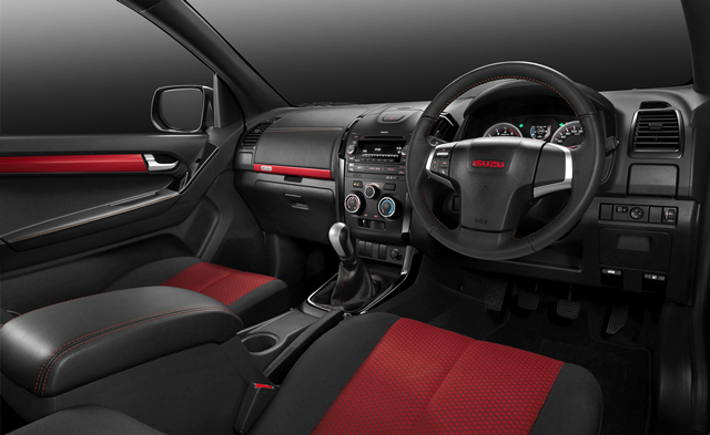 ภายนอก ชุดแต่งดีไซน์ใหม่! พร้อมกระจังหน้าแบบสปอร์ต รับกับสเกิร์ตหน้าดีไซน์เท่ กันชนหน้าสีเทาดำ Front Bumper Garnish ที่ตัดรับกับเส้น Red Line สีแดง ดีไซน์ยาวต่อเนื่องรับกับไฟหน้าอย่างลงตัว มาพร้อมสติกเกอร์คาดหน้า-หลัง โดดเด่นไม่ซ้ำใครและสัญลักษณ์ ISUZU สีแดง เสริมความสปอร์ตให้มีสไตล์ ชุดไฟตัดหมอก ใหม่! สีเดียวกับตัวรถ พร้อมกรอบสีเทาดำ ดีไซน์ต่อเนื่องรับกับสเกิร์ตหน้าแบบสปอร์ต เสริมความดุดันกับสปอร์ตบาร์ดีไซน์ใหม่! สีทูโทน