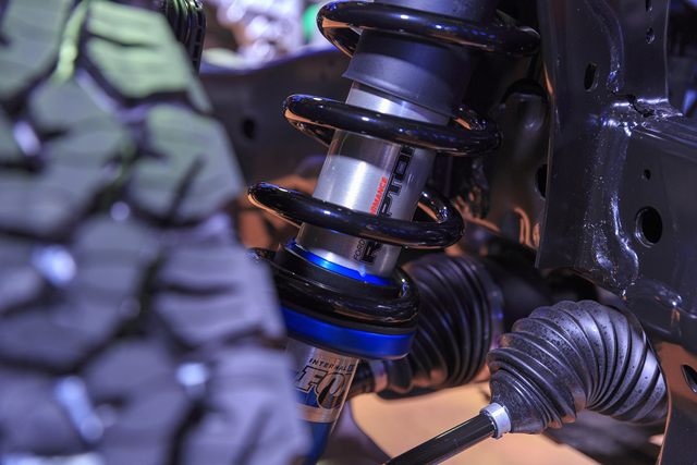 ระบบช่วงล่างสายพันธุ์รถแข่งของ Ranger RAPTOR เน้นรองรับกับการขับขี่ที่ความเร็วสูงบนสภาพพื้นผิวขรุขระ โดยที่ผู้ขับขี่ยังสามารถควบคุมรถได้อย่างสมบูรณ์แบบและได้รับความสบายอย่างเต็มที่ ด้วยโช้กแบบ Position Sensitive Damping (PSD) ที่จะเพิ่มแรงต้านเมื่อมีการกระแทกเต็มช่วงยุบกระบอกสูบ เพื่อช่วยเพิ่มประสิทธิภาพการขับขี่แบบออฟโรดให้ดียิ่งขึ้น และจะลดแรงต้านเมื่อขับขี่บนถนนทางเรียบ เพื่อการขับขี่ที่นุ่มนวล จึงเห็นได้ว่าระบบนี้ถูกออกแบบมาเพื่อการขับขี่ทั้งสองรูปแบบ โช้กอัพผลิตขึ้นมาเป็นพิเศษโดย Fox Racing Shox ใช้ลูกสูบขนาด 46.6 มิลลิเมตร ทั้งคู่หน้าและหลัง ช่วงล่างถูกออกแบบมาให้มีระยะการให้ตัวของล้อสูงเพื่อความสามารถในการซับแรงกระแทกขณะขับออฟโรด แต่ด้วยระบบบายพาสภายใน (Internal Bypass technology) จึงทำให้การขับขี่บนถนนทางเรียบเป็นไปอย่างราบรื่น