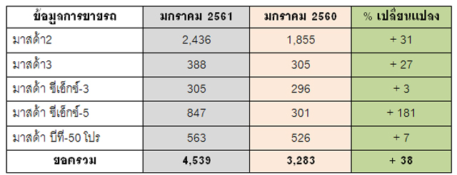 ยอดการจำหน่ายรถยนต์มาสด้าประจำเดือนมกราคม 2561 เปรียบเทียบกับปี 2560