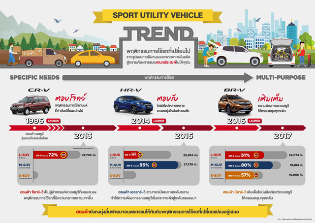 นายพิทักษ์ พฤทธิสาริกร ประธานเจ้าหน้าที่บริหารปฏิบัติการ บริษัท ฮอนด้า ออโตโมบิล (ประเทศไทย) จำกัด กล่าวว่า "นับตั้งแต่การเปิดตัว ฮอนด้า ซีอาร์-วี เป็นครั้งแรกในประเทศไทย เมื่อปี 2539 จนประสบความสำเร็จในการเข้ามาสร้างตลาดรถยนต์เอสยูวีในระดับบน ทำให้ความต้องการรถเอสยูวีเพิ่มมากขึ้น และกระจายไปสู่ลูกค้าทุกกลุ่ม ฮอนด้า จึงเปิดตัว ฮอนด้า เอชอาร์-วี เป็นครั้งแรกในประเทศไทยเมื่อปี 2557 เติมเต็มตลาดรถยนต์เอสยูวีในระดับคอมแพกต์เซกเมนต์ โดยได้เข้าไปนั่งในใจ และเป็นที่ชื่นชอบของลูกค้าชาวไทย พิสูจน์ได้ด้วยยอดขายสะสมจนถึงปัจจุบันเกือบ 62,000 คัน จากนั้นจึงเปิดตัว ฮอนด้า บีอาร์-วี ในปี 2559 เติมเต็มความต้องการรถเอสยูวีในระดับซับคอมแพกต์ ส่งผลให้ไลน์ผลิตภัณฑ์รถเอสยูวีของฮอนด้าครอบคลุมทุกระดับของตลาด สามารถตอบโจทย์ความต้องการที่หลากหลายในทุกรูปแบบ การใช้ชีวิตได้อย่างสมบูรณ์ ส่งผลให้ฮอนด้าเป็นผู้นำตลาดรถเอสยูวีด้วยส่วนแบ่งการตลาดรวมสูงถึง 63% ในปี 2560 ที่ผ่านมา"