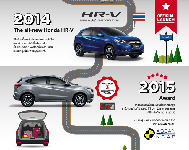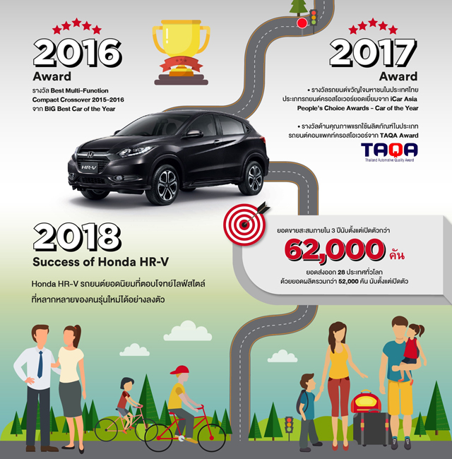 บริษัท ฮอนด้า ออโตโมบิล (ประเทศไทย) จำกัด ประกาศความสำเร็จของ "ฮอนด้า เอชอาร์-วี (Honda HR-V)" ที่สุดแห่งยนตรกรรมสปอร์ตครอสโอเวอร์ ซึ่งเป็นหนึ่งใน Global Model ที่ได้รับความนิยมทั่วโลกด้วยยอดจำหน่ายสะสมสูงกว่า 1.5 ล้านคัน (ธันวาคม 2556 - ธันวาคม 2560) นับตั้งแต่เปิดตัวเป็นครั้งแรกในประเทศญี่ปุ่น เมื่อเดือนธันวาคม 2556 และยังได้รับกระแสตอบรับที่ดีอย่างต่อเนื่องตั้งแต่การเปิดตัวในไทยเมื่อเดือนพฤศจิกายน 2557 ส่งผลให้ครองตำแหน่งยอดขายสูงสุดในตลาดเอสยูวี 3 ปีซ้อน ด้วยยอดจำหน่ายสะสมสูงกว่า 62,000 คัน ถือเป็นผู้เปิดตลาดรถยนต์ครอสโอเวอร์ระดับคอมแพกต์เซกเมนต์ ด้วยส่วนแบ่งทางการตลาดสูงถึง 80% หรือคิดเป็น 29% ของตลาดรถยนต์เอสยูวีรวมในปี 2560 รวมทั้งคว้ารางวัลยนตรกรรมยอดเยี่ยมในไทยได้ถึง 10 รางวัล จาก 6 สถาบันชั้นนำ ตลอด 3 ปีที่ผ่านมา