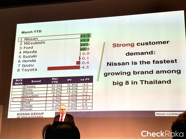 มร. อันตวน บาร์เตส ประธาน บริษัท นิสสัน มอเตอร์ (ประเทศไทย) จำกัด กล่าว "นิสสันเป็นแบรนด์ยานยนต์ที่มีการเติบโตรวดเร็วที่สุดในประเทศไทยเมื่อปีที่แล้ว มีส่วนแบ่งตลาดเพิ่มขึ้น 1.3 เปอร์เซ็นต์ไปอยู่ที่ 6.9 เปอร์เซ็นต์ในช่วงสิ้นปีงบประมาณ และเรามีวิสัยทัศน์ที่แข็งแกร่งเพื่อสร้างการเติบโตอย่างยั่งยืนต่อไปนับตั้งแต่วันนี้จนถึงปี พ.ศ. 2565"