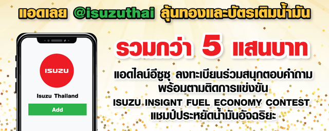 อีซูซุ (Isuzu) จัดกิจกรรมเอาใจลูกค้า กับ อีซูซุ แจกโชค! ทอง 20 บาท และบัตรเติมน้ำมันมูลค่า 1,000 บาท รวมแล้วกว่า 100 รางวัล กิจกรรมดีๆ แบบนี้ อย่ารอช้า คลิก ! https://goo.gl/YcYC7j เพื่อร่วมสนุก พร้อมติดตามการแข่งขัน แชมป์ประหยัดน้ำมันอัจฉริยะไปกับเรา