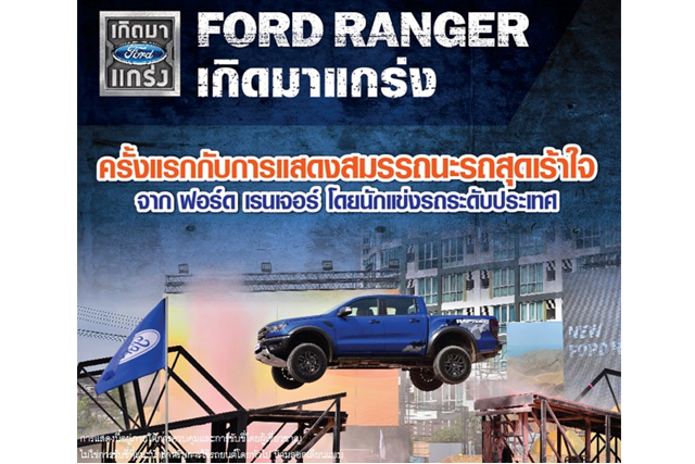 ฟอร์ด (Ford) ประเทศไทย สานต่อกระแสความนิยมอันท่วมท้นของ ฟอร์ด เรนเจอร์ ใหม่ (New Ford Ranger) จัดงาน "ฟอร์ด เรนเจอร์ เกิดมาแกร่ง" อย่างยิ่งใหญ่ ในจังหวัดภูเก็ต เชียงใหม่ และชลบุรี ตลอดเดือนกันยายนนี้ เพื่อให้ผู้บริโภคได้สัมผัสประสบการณ์การขับขี่ของสุดยอดรถกระบะนิยาม 'เกิดมาแกร่ง' ที่วางจำหน่ายในประเทศไทยทั้ง 20 รุ่น พร้อมชมโชว์พิเศษสุดเร้าใจจากนักขับมืออาชีพ ร่วมสนุกในกิจกรรมบันเทิงจากศิลปินค่ายอาร์สยาม รับของที่ระลึก อาหารฟรีตลอดงาน พร้อมลุ้นรางวัลสุดพิเศษ อาทิ ทองคำ และเครื่องใช้ไฟฟ้า