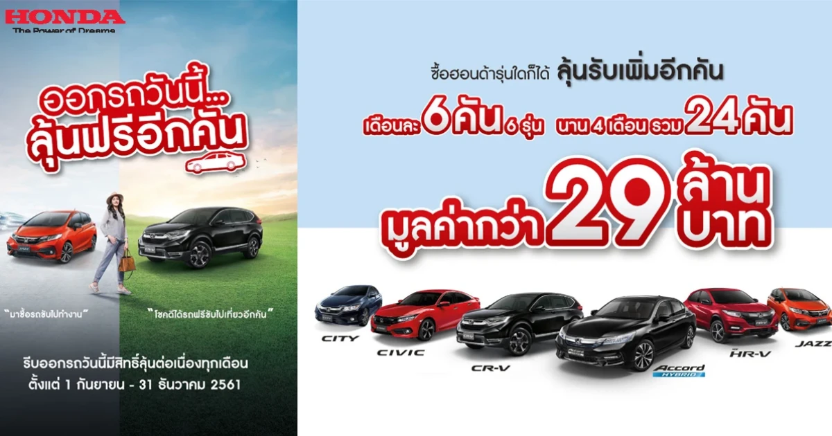 ฮอนด้า เอาใจลูกค้า กับแคมเปญ "ออกรถวันนี้...ลุ้นฟรีอีกคัน" ร่วมลุ้นรับรถยนต์ฮอนด้า มูลค่ากว่า 29 ลบ.
