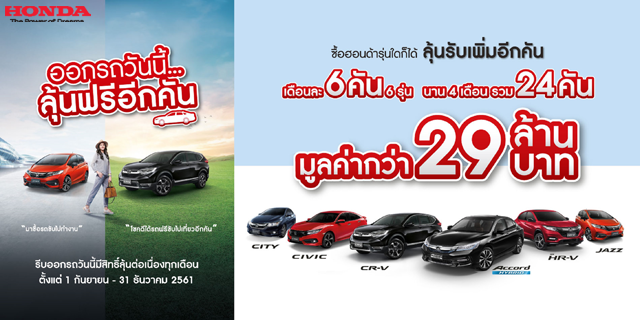 บริษัท ฮอนด้า ออโตโมบิล (ประเทศไทย) จำกัด มอบที่สุดแคมเปญแห่งปี "ออกรถวันนี้... ลุ้นฟรีอีกคัน" มุ่งเอาใจลูกค้าที่มองหารถยนต์ ที่พร้อมตอบโจทย์ในทุกไลฟ์สไตล์ ด้วยรถยนต์ฮอนด้ากว่า 12 รุ่น ซึ่งครอบคลุมในทุกเซ็กเมนต์ เมื่อลูกค้าซื้อรถยนต์ฮอนด้ารุ่นใดก็ได้ ตั้งแต่วันที่ 1 กันยายน - 31 ธันวาคม 2561 และรับรถยนต์ภายในวันที่ 31 ธันวาคม 2561 จะได้รับสิทธิ์ลุ้นรางวัลรถยนต์ฮอนด้าเพิ่มอีกคัน เดือนละ 6 คัน 6 รุ่น นาน 4 เดือน รวม 24 คัน โดยรางวัลรถยนต์ฮอนด้าทั้ง 6 รุ่น ได้แก่ ฮอนด้า แอคคอร์ด ไฮบริด รุ่น HYBRID TECH สีดำคริสตัล (มุก) จำนวน 4 รางวัล ฮอนด้า ซีอาร์-วี รุ่น DT-EL 4WD สีดำคริสตัล (มุก) จำนวน 4 รางวัล ฮอนด้า ซีวิค รุ่น TURBO RS สีแดงแรลลี่ จำนวน 4 รางวัล ฮอนด้า เอชอาร์-วี รุ่น RS สีแดงแพสชั่น (มุก) จำนวน 4 รางวัล ฮอนด้า แจ๊ซ รุ่น RS+ สีส้มฟีนิกซ์ (มุก) จำนวน 4 รางวัล และ ฮอนด้า ซิตี้ รุ่น SV+ CVT สีน้ำเงินคอสมิก (เมทัลลิก) จำนวน 4 รางวัล มูลค่ารวมกว่า 29,596,000 บาท โดยจะทำการจับรางวัลผู้โชคดีทุกเดือนรวม 4 ครั้ง หากชื่อของท่านยังไม่ถูกจับรางวัล จะได้รับสิทธิ์ลุ้นต่อเนื่อง จนจบแคมเปญ ซึ่งทางฮอนด้า จะทำการประกาศรายชื่อผู้โชคดีทางเว็บไซต์ www.honda.co.th นอกจากนี้ ยังมาพร้อมแคมเปญพิเศษอื่นๆ เพื่อให้ลูกค้าเป็นเจ้าของรถยนต์ฮอนด้าได้ง่ายขึ้น อาทิ