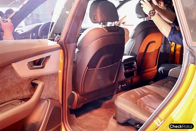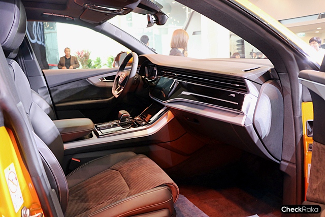 ภายในของ Audi Q8 55TFSI quattro S Line หรูหราด้วยคอนโซลผสานความหรูและทรงสปอร์ต ระบบ MMI Naigator plus with MMI touch response พร้อมจอควบคุมแบบมัลติฟังก์ชัน เบาะคู่หน้าแบบ S Sport หุ้มหนัง Valcona ตกแต่งแบบ diamond cut และสัญลักษณ์ S Line เค่รืองเสียงจาก Bang & Olufen ระบบ 3 มิติ ระบบปรับอากาศอัตโนมัติแยกอิสระ ซ้าย-ขวาและช่องแอร์ด้านหลัง