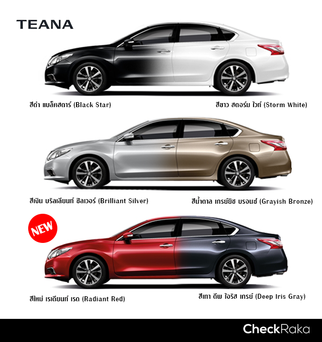 เทียน่า ใหม่ มาพร้อมสีใหม่ เรเดียนท์ เรด (Radiant Red) และอีก 5 สีให้เลือก ได้แก่ สีเทา ดีพ ไอริส เกรย์ (Deep Iris Gray) สีขาว สตอร์ม ไวท์ (Storm White) สีดำ แบล็คสตาร์ (Black Star) สีเงิน บริลเลียนท์ ซิลเวอร์ (Brilliant Silver) และสีน้ำตาล เกรย์ยิช บรอนซ์ (Grayish Bronze) โดยราคาของแต่ละรุ่นย่อย มีดังนี้