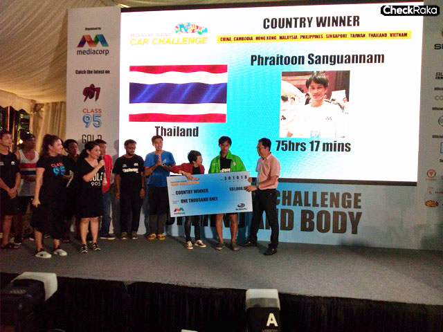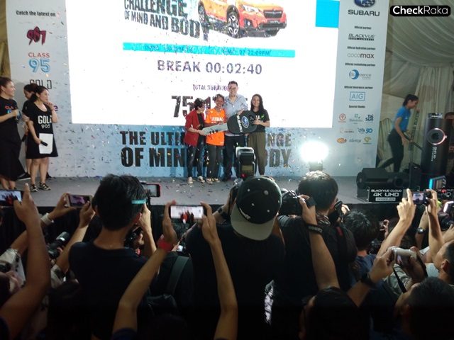 ผลการแข่งขันแม้คนไทยยืนแตะได้ 75 ชั่วโมง 17 นาที นับว่าสถิติสูงสุดของคนไทย แต่ก็ไม่อาจต้านทานเจ้าภาพสิงคโปร์ได้! โดยผู้ชนะสาว Analiza Mokhtar จากสิงคโปร์ รับรางวัลรถยนต์ Subaru XV ไปครอบครอง ส่วนคุณไพฑูรย์ สงวนนาม คนไทยรองแชมป์ รับเงินรางวัลรองชนะเลิศอันดับหนึ่ง 5,000 เหรียญสิงคโปร์ รางวัล asian winner 5,000 เหรียญสิงคโปร์ รางวัลเวลาสูงสุดอันดับหนึ่งของประเทศไทย 1,000 เหรียญสิงคโปร์ รางวัลส่วนแบ่งจากชนะประเภททีมครบ 10 คนนานที่สุด 1,000 เหรียญสิงคโปร์ และรางวัลพิเศษเมื่อผ่านทุกๆ 24/48/72 ชม.ครั้งละ 100 เหรียญสิงคโปร์ รวมมูลค่ากว่า 12,300 เหรียญสิงคโปร์