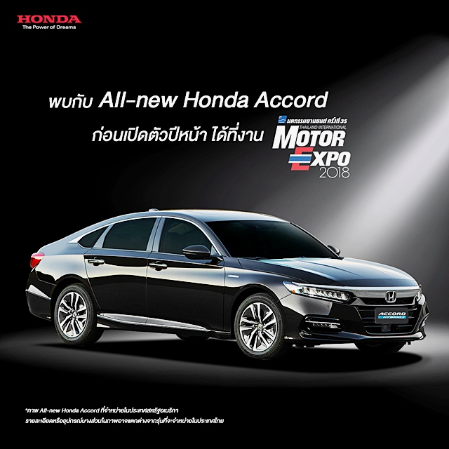 สัมผัส ฮอนด้า แอคคอร์ด ใหม่ เจเนอเรชั่นที่ 10 ครั้งแรกที่บูทฮอนด้า ในงานมหกรรมยานยนต์ ครั้งที่ 35 หรือ The 35th Thailand International Motor Expo 2018 ระหว่างวันที่ 30 พฤศจิกายน - 10 ธันวาคม 2561 ณ บูทฮอนด้า (A14) อาคารชาเลนเจอร์ ฮอลล์ 1 - 3 อิมแพ็ค เมืองทองธานี ก่อนเปิดตัวอย่างเป็นทางการในประเทศไทยช่วงต้นปี 2562