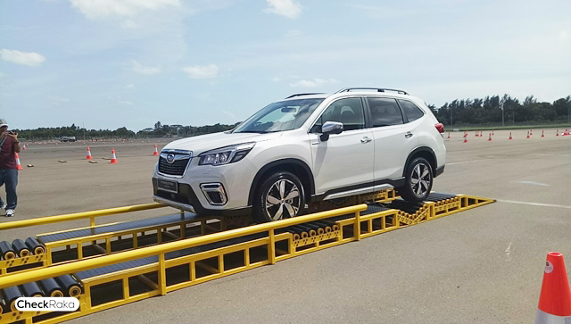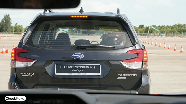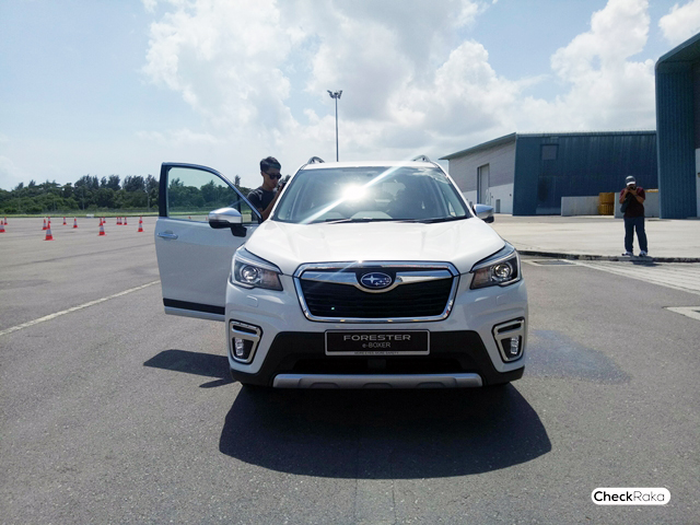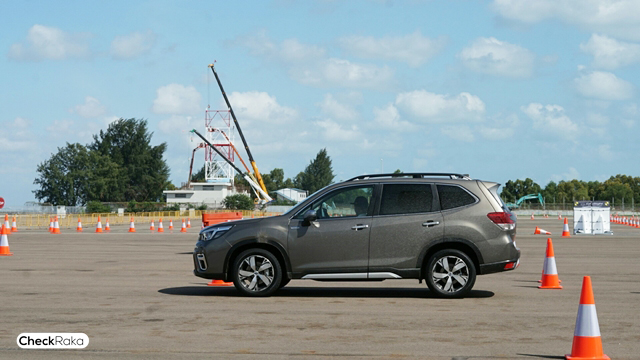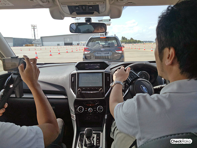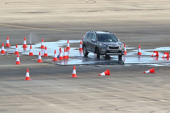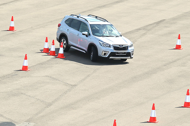 ในการทดสอบ Subaru Forester e-Boxer จะมีหลายจุดที่ได้ทำการจำลองสนามไว้ให้เราได้สัมผัสความนุ่ม เงียบ ช่วงล่างและการควบคุมรถ จังหวะแรกที่เราได้ออกตัวและกดคันเร่งหวดกันจนมิดไมล์ แม้ช่วงแรกอาจจะต้องเรียกแรงฮึดขึ้นมาสักหน่อยแต่ก็ไม่ปล่อยให้คอยนานสำหรับรถกึ่งไฟฟ้าถือว่าทำได้ดีในช่วงออกตัว (อยากลองขับให้ยาวอีกนิด) ต่อมาด้วยฐานสลาลม เปลี่ยนอารมณ์เป็นเป็นซิกแซก ยังคุมความเร็วไว้ที่ 60-70 ถือว่าการทำงานของช่วงล่างและการควบคุมพวงมาลัยเสถียรเข้ากัน เกาะถนนได้ดี ไม่มีเหวี่ยงท้ายให้น่าตกใจ