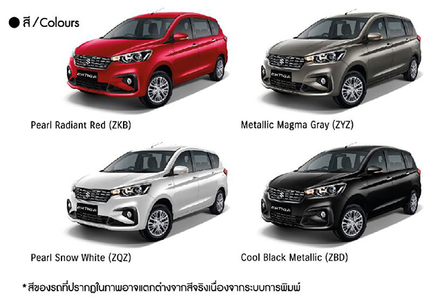 All New Suzuki ERTIGA ที่มีให้เลือกทั้งหมด 4 สี ได้แก่ Radian Red, Magma Grey, Pearl White Snow และ Prime Cool Black โดยมี 2 รุ่น คือ GL (AT) และ GX (AT) พร้อมกันนี้ ซูซูกิจัดสิทธิพิเศษสำหรับลูกค้าที่ทดลองขับ All New Suzuki ERTIGA ที่โชว์รูมรถยนต์ซูซูกิ ทั่วประเทศ รับบัตรชมภาพยนตร์จำนวน 2 ที่นั่ง ตั้งแต่วันที่ 6 กุมภาพันธ์ - 30 เมษายน 2562