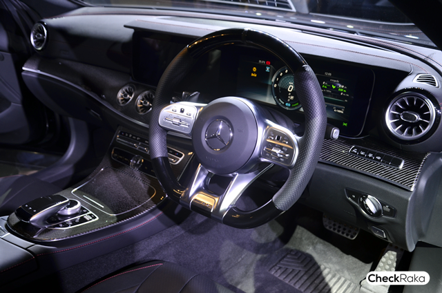 Mercedes-AMG E 53 4 MATIC+Coupe ภายในตกแต่งด้วยวัสดุ Metal-weave และ Black piano เบาะที่นั่งหุ้มของเอเอ็มจีและตราสัญลักษณ์เอเอ็มจี ด้วย ARTICO leather ตัดสลับ DINAMICA Microfibre เป็นอุปกรณ์มาตรฐาน พวงมาลัยแบบ AMG Performance steering wheel หุ้มหนัง nappa ตกแต่งด้วย DINAMICA Microfibre ที่เป็นพวงมาลัยนิรภัยพร้อมเพาเวอร์ปรับระดับด้วยไฟฟ้า แบบปรับน้ำหนักตามระดับความเร็ว เพิ่มความปลอดภัยด้วยระบบป้อนเข็มขัดนิรภัยอัตโนมัติ สำหรับผู้ขับขี่และผู้โดยสารด้านหน้า รวมถึงเพลิดเพลินกับระบบมัลติมีเดีย อย่างหน้าจอแสดงผลข้อมูลแบบ Digital widescreen cockpit ระบบ MB Audio 20 พร้อมจอแสดงผลขนาดใหญ่ 12.3 นิ้ว ฟังก์ชันเชื่อมต่อโทรศัพท์มือถือระบบปฏิบัติการ Apple CarPlay และ Android Auto ระบบชาร์จมือถือแบบไร้สาย ระบบเสียงรอบทิศทาง Burmester surround sound system รวมถึงระบบไฟเรืองแสงล้อมรอบห้องโดยสารแบบ 64 สี