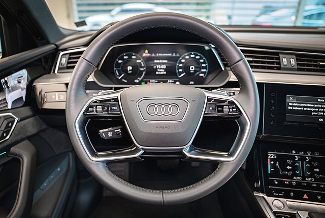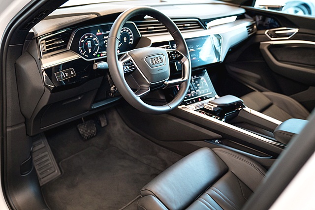 Audi e-tron 55 quattro มาพร้อมกล้องแสดงภาพด้านข้าง Virtual exterior mirrors แสดงภาพบนจอ OLED 7 นิ้ว ที่แผงประตูซ้าย-ขวา มาตรวัดแบบจอแสดงผลการขับขี่ Virtual Cockpit ขนาด 12.3 และ MMI Navigation ขนาด 10.0 นิ้ว